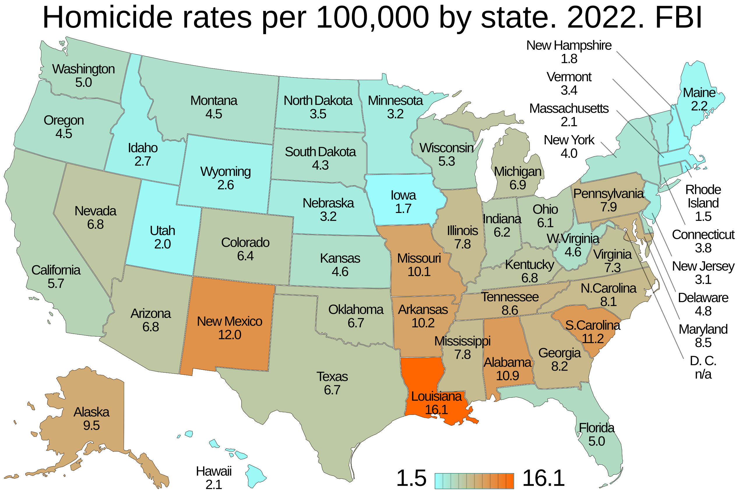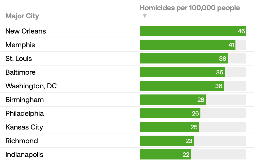 And a list of the homicide rates in major American cities in 2022.