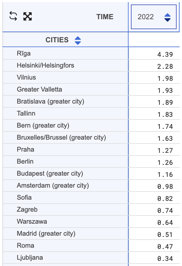 And a list of the cities with the highest homicide rate in Europe from 2022, from Eurostat data. Again, cities in the Baltic region top the list.