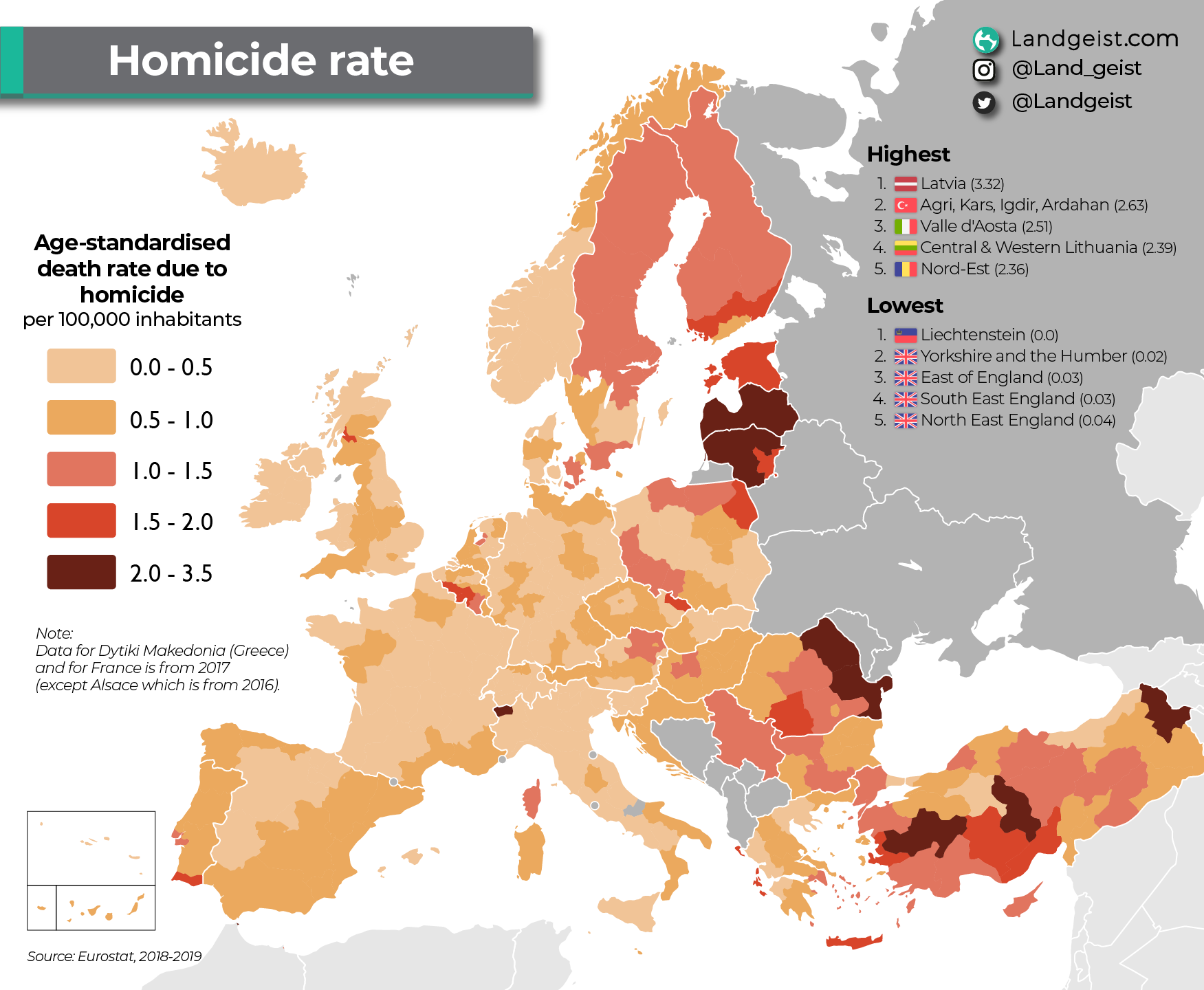 Here’s a map of the homicide statistics in 2022 from Landgeist, which shows that the most dangerous regions of the continent (and the United Kingdom and Turkey) were in the Baltics, parts of Romania, and Turkey.